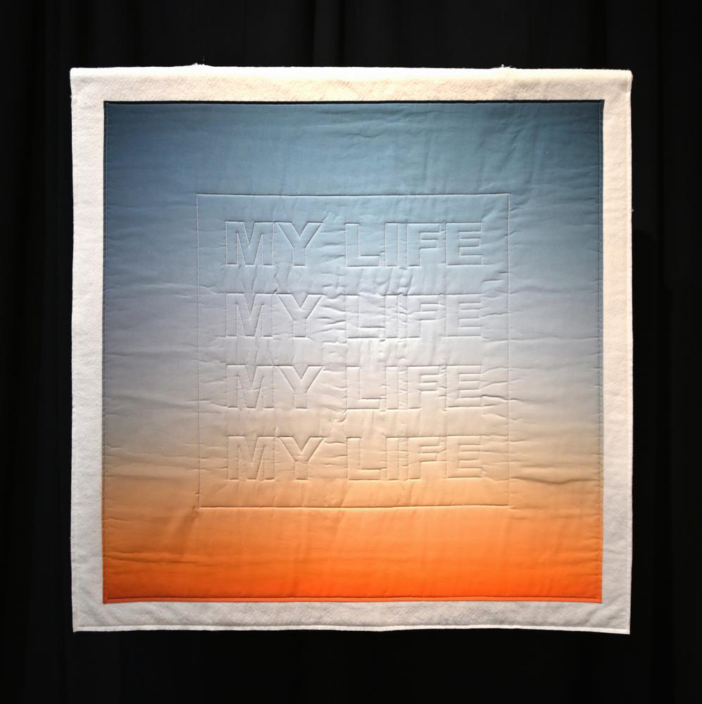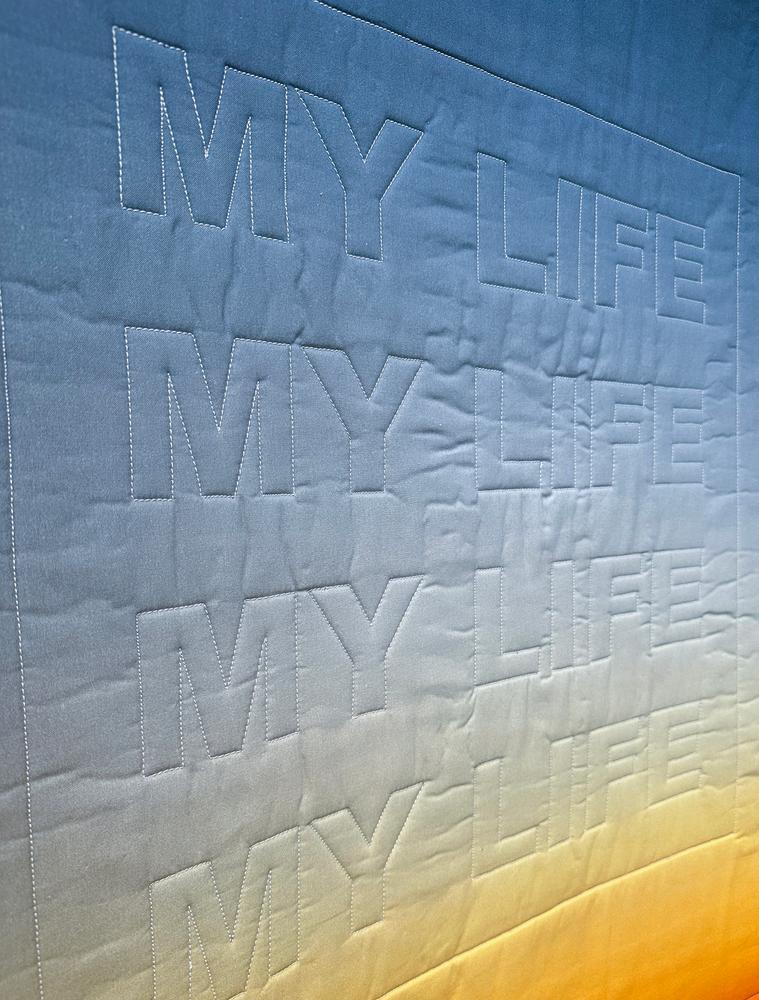 - My Life, My Life, My Life, My Life, Digital textile print on cotton, layered with cotton-blend batting and quilted with heavy-weight cotton thread, 94cm x 94cm, 2025