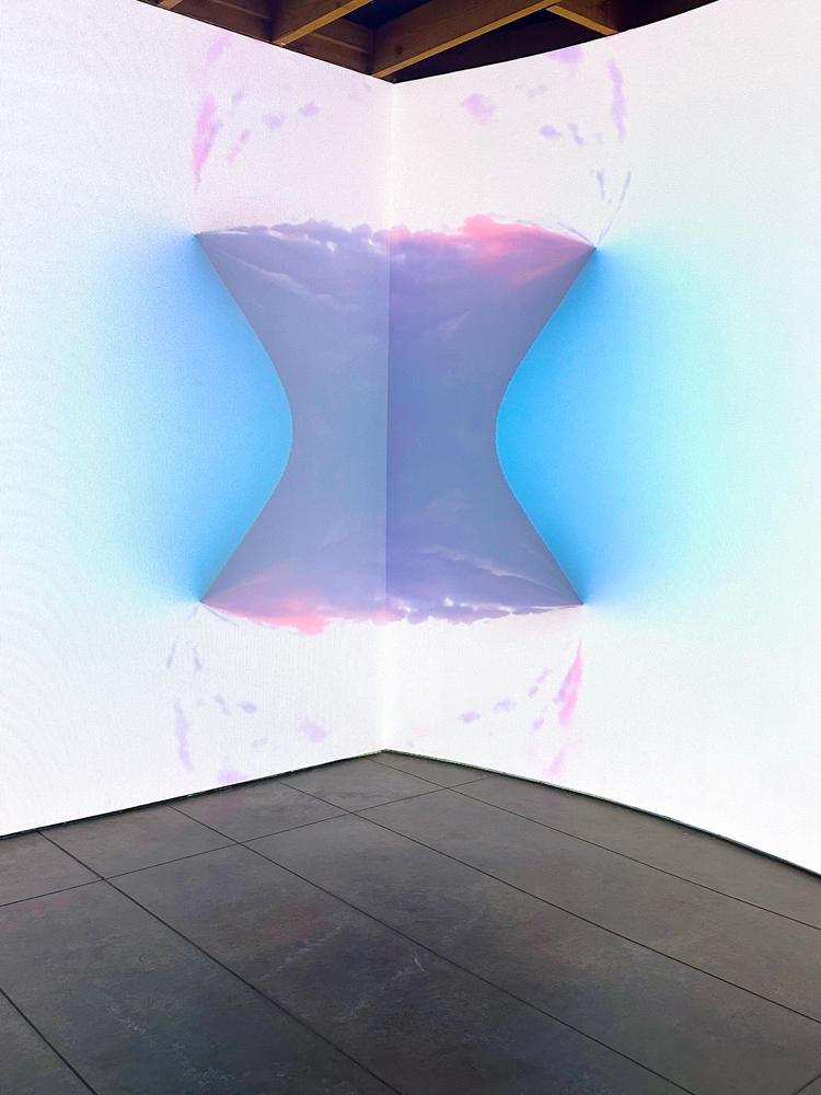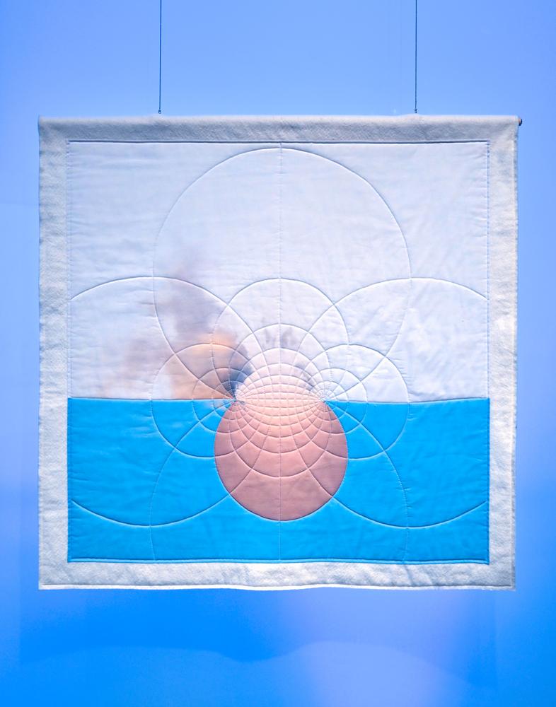 "As a way to confront the emotional toll of overcast winters, Evan Roth began seeking out the sun, a meditative process where he searches for the moments when sunlight peeks through the parting clouds around his home in Berlin. For Pathfinding, Roth applies this practice to the Arizona sky. By digitally manipulating photographs using centuries-old cartographic mathematics utilized in map making, he distorts images he captured of the Scottsdale sky. The algorithms he uses were originally designed to translate spheres, like the Earth, to a flattened, two dimensional plane for maps. This process creates distortions in the form and scale of the original images. One of the results of this experimentation is a slow-moving, meditative video of the sky melting and morphing into itself. The photographs that Roth captured during his time in Scottsdale also appear in his embroidered quilts. Each stitched line is a visual representation of the historic cartographic math that was used to warp the image of the sky printed on the fabric, revealing his process and illustrating the precise mark making of the thread.